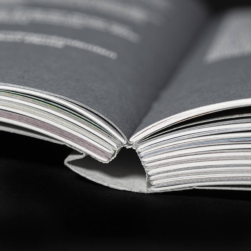 Freirückenbroschur in Fadenheftung mit geklebtem Vor/Nachsatz