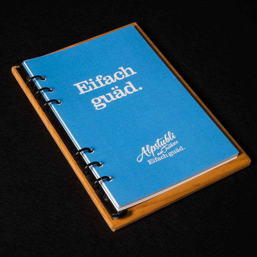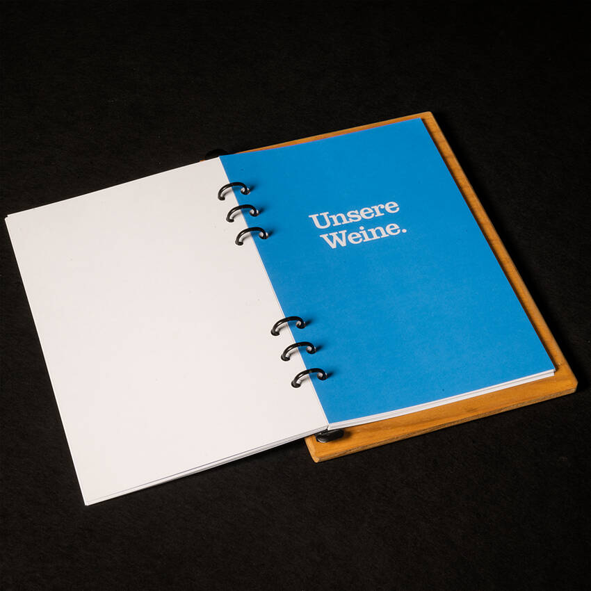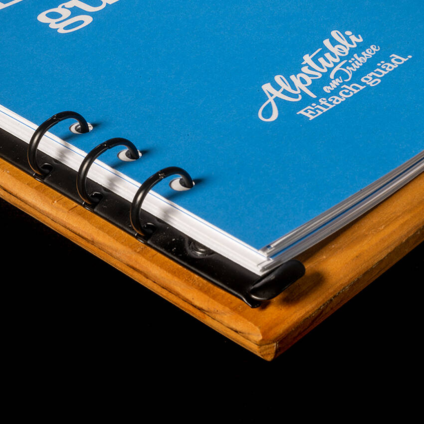 Menükarte mit laminierten Titelblättern im Digitaldruck, Lochung für vorgefertigte Heftvorrichtung auf Holzbrett, Aufbau und Einrichten von Templates für eigenständige Inhaltsanpassungen druch Kunde