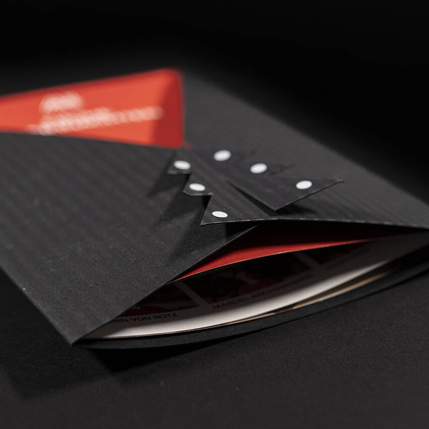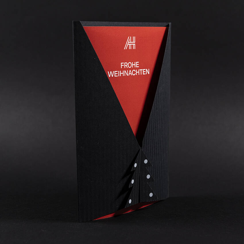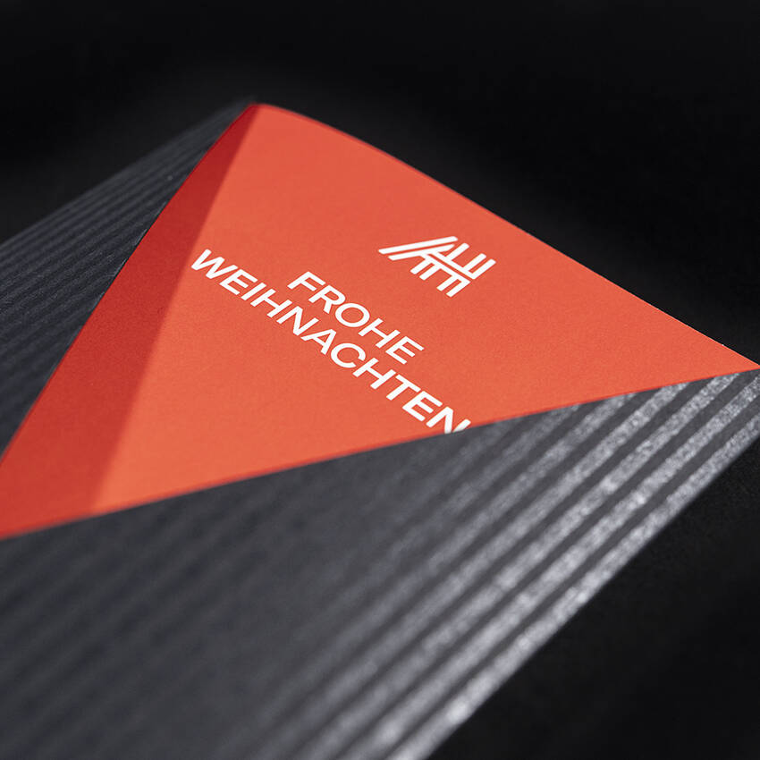 Weihnachtskarte im Digitaldruck mit weissem Druck und Lack auf schwarzem Papier.
